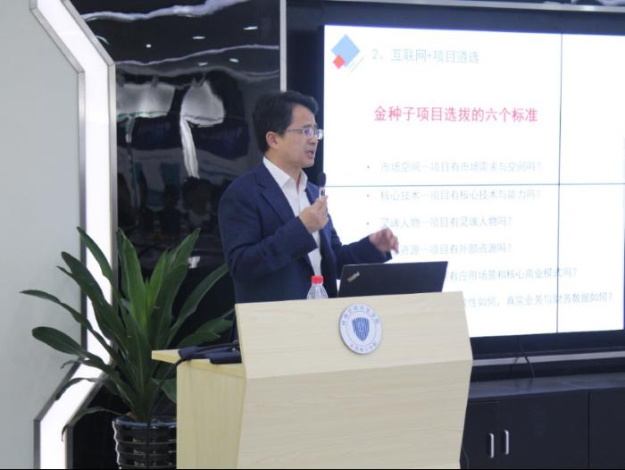 本次报告,荣辉桂老师主要从互联网+起源,互联网+双创,项目遴选培育和项目价值四个方面展开分享。荣辉桂指出,一个达标的金种子项目需要同时具备市场需求和空间、核心技术和能力、核心灵魂人物团队、外部资源、商业模式、真实业务数据六大要素。依据自身实践经验,他与在场师生分享四个参赛重点:团队、坚持、细节、成果与落地。荣辉桂表示,互联网+大赛成果的成功转化落地,将对个人发展具有重大意义,鼓励同学们积极参与,要“抱有高远的追求和理想”。